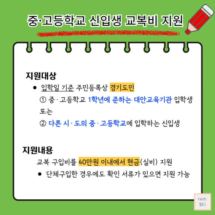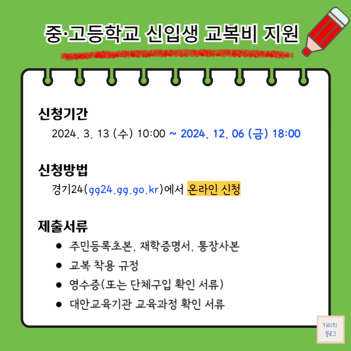 2024 경기도 중·고등학교 신입생 교복비 지원 신청 정보를 알아보았습니다. 경기도민이라면 다른 시·도의 학교에 입학하더라도 교복비를 지원받을 수 있으니 놓치지 말고 꼭 신청하시기 바랍니다.