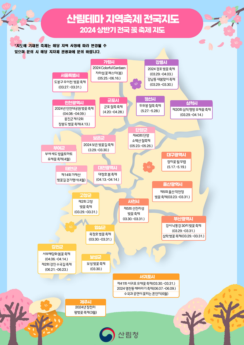 부산에서는 대저생태공원과, 사상구 작동제방 벚꽃길에서 3일간 벚꽃축제가 열립니다. 이 두 곳은 대표적인 부산 벚꽃축제입니다. 2024 벚꽃축제 일정 지도다음은 삼림청에서 발표한 2024 벚꽃축제 일정 지도입니다. 벚꽃축제뿐만 아니라 철쭉, 유채꽃, 장미 등 다양한 꽃 축제가 함께 표시되어 있습니다. 지도를 확인하시고 꽃 축제 일정을 놏히지 마시길 바랍니다.