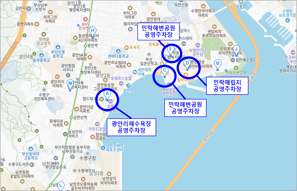 축제 당일여 광안리 해수욕장 주변에 공영과 민영 주차장이 여러 곳 운영되지만, 도로가 좁아서 차가 많이 막히기 때문에 차량 이용 자체를 비추천합니다.