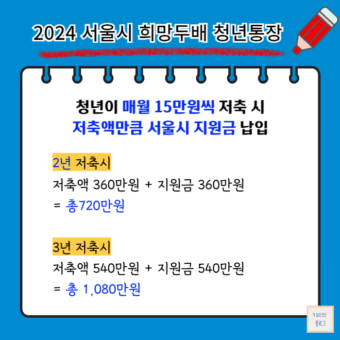 월 15만 원씩 3년 간 저축하면 본인 저축액 540만 원에 서울시 지원금 540만 원이 더해져 총 1,080만 원을 받게 됩니다.
