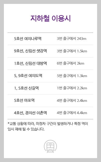 하지만 당일 인파가 몰리면 여의나루역과 여의도역 등은 안전을 위해 미정차할 수 있으니 걷기 편한 차림으로 가시는 것을 추천드립니다.