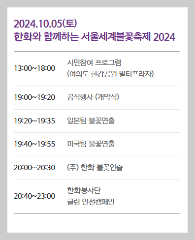 여의도 불꽃축제는 매년 가을에 개최되며, 이번에도 10월 첫 주 주말에 진행될 예정입니다. 오후부터 다양한 부대행사가 시작되며, 메인이벤트인 불꽃놀이는 저녁 시간에 진행됩니다.
