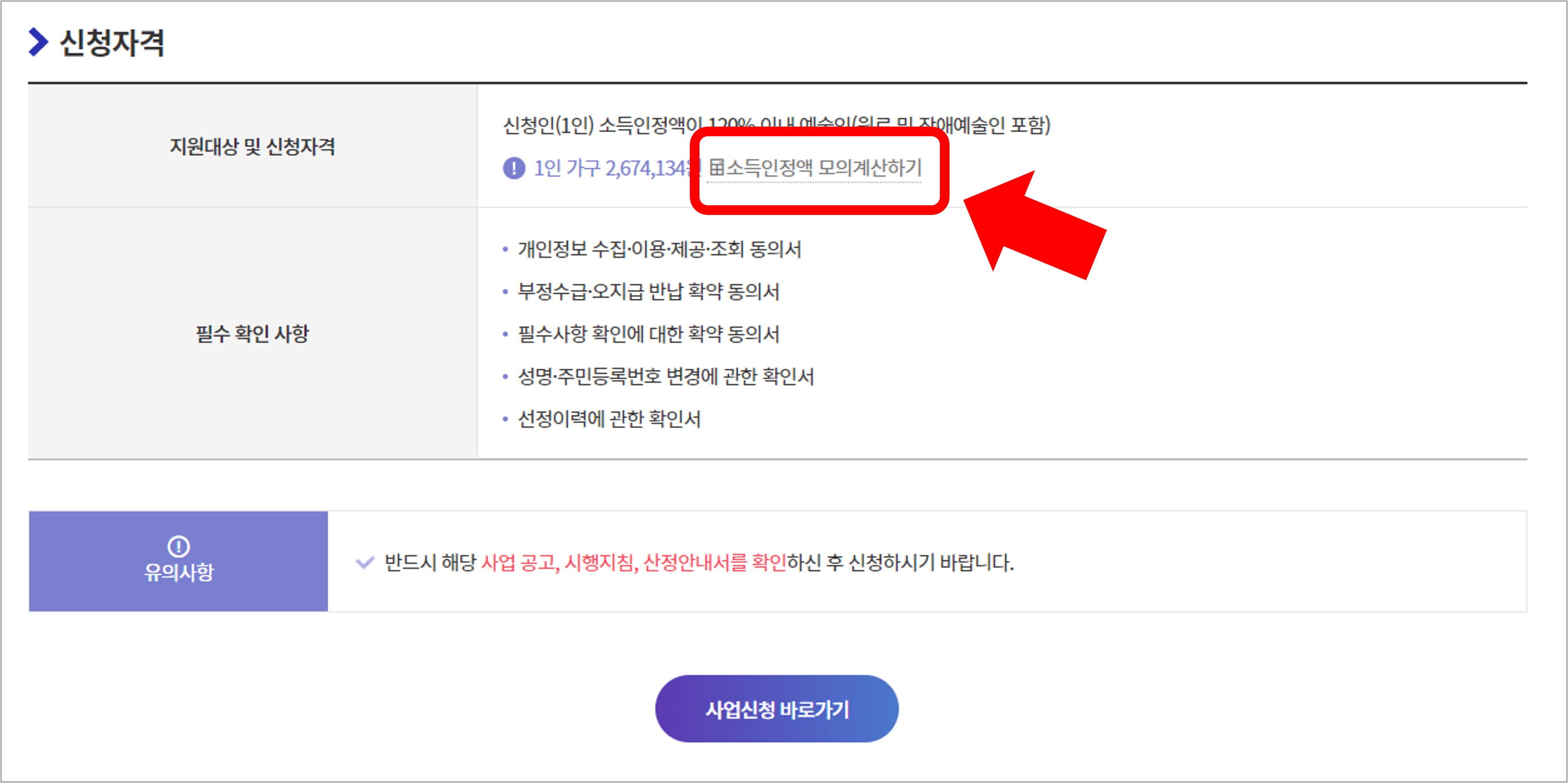 신청 페이지에서 소득인정액 모의계산도 가능합니다.