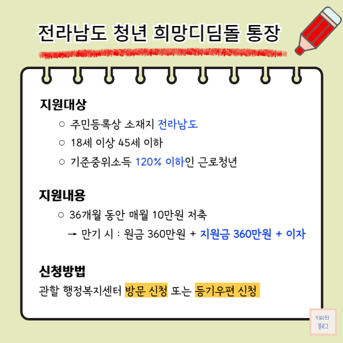 2024 청년 적금 추천을 위해 오늘은 전라남도 청년 희망디딤돌 통장 지원대상과 지원내용, 신청방법 등을 소개해 드리겠습니다.