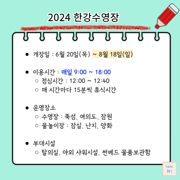 이번 포스팅에서는 한강수영장 개장일 및 이용요금, 그리고 이용할 때 유용한 팁들을 정리해 보겠습니다.