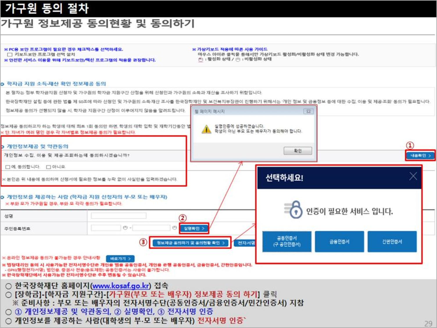 가구원 동의를 위해서는 부모님 또는 배우자의 전자서명수단(공동인증서/금융인증서/민간인증서)을 준비해야 합니다.