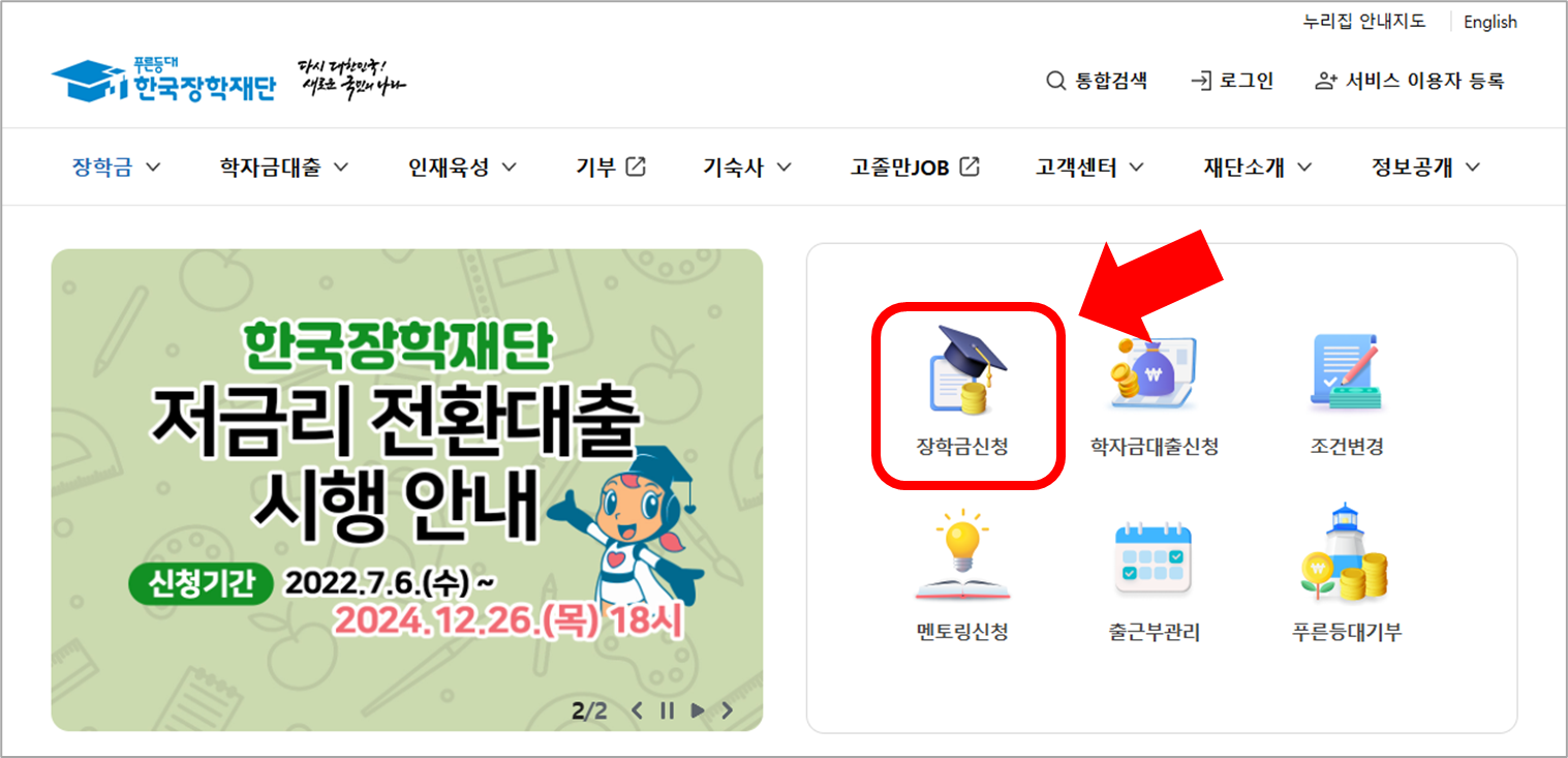12월 26일 18시까지 한국장학재단 홉페이지나 앱을 통해서 학생 본인이 장학금 통합 신청을 합니다.