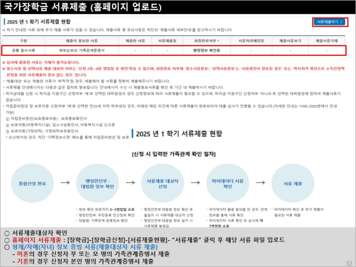 그 외의 제출서류는 홈페이지느 [장학금] → [장학금신청] → [제출서류현황]을 통해 확인하시고, [서류제출]을 클릭해서 서류를 업로드하면 됩니다.