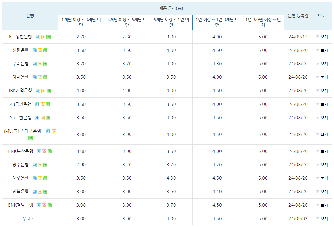 은행별 제공 금리는 다음과 같습니다.