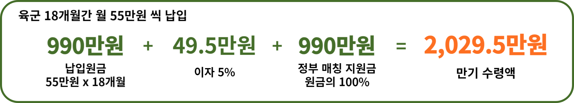 게다가 2025년부터는 납입 한도가 기존 40만 원에서 55만 원으로 상향되고, 정부 지원금은 납입 원금의 100%가 지원되기 때문에 18개월 만기 시 2,029.5만 원을 수령하게 됩니다.