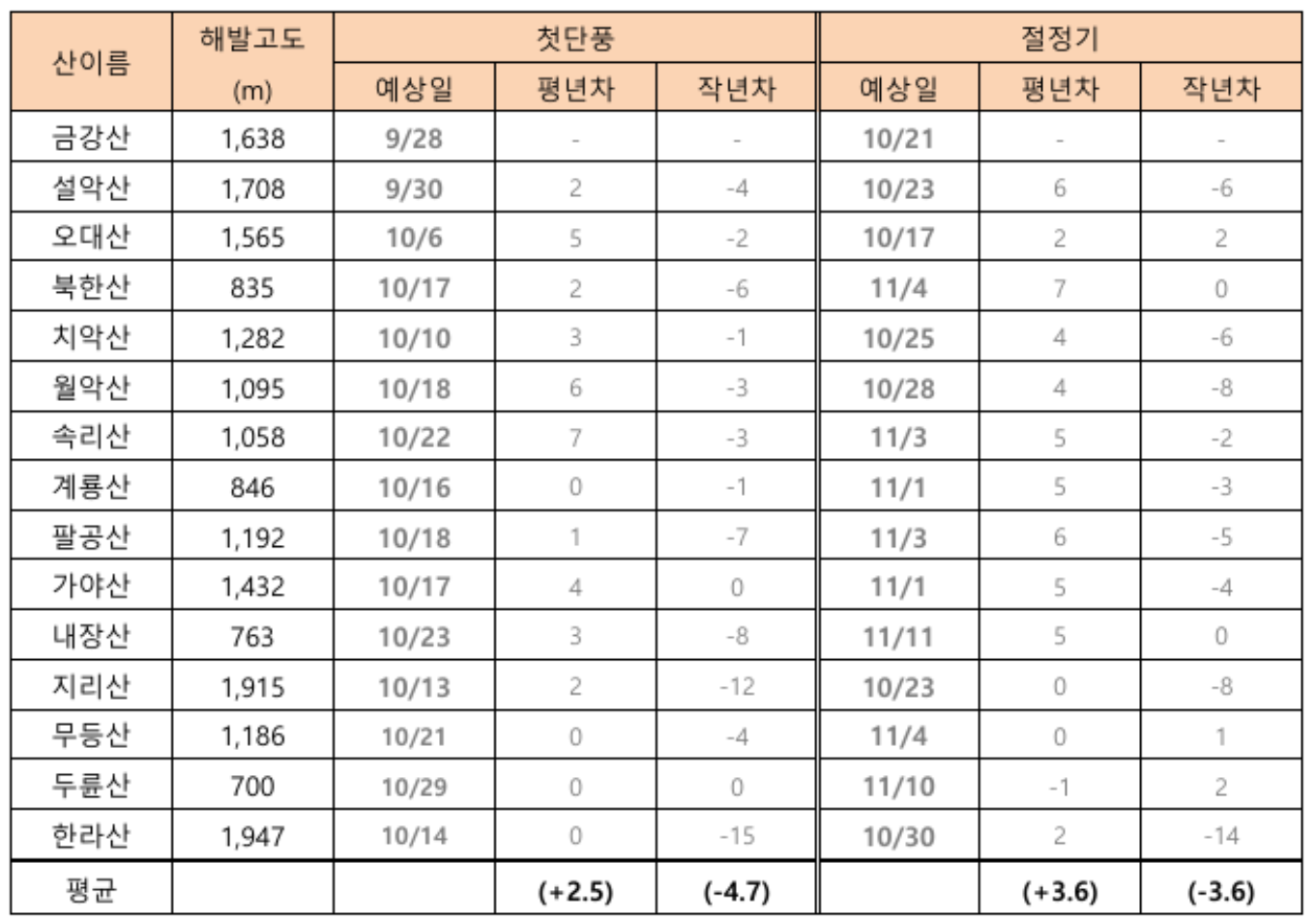 주요 명산 단풍절정기 예측