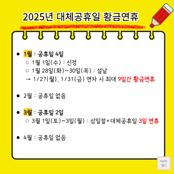 2025년에는 대체공휴일도 많고 주말과 붙은 공휴일도 많아서 연휴가 꽤 많은 편입니다. 2025년 대체공휴일과 황금연휴를 미리 확인하시고 내년 휴가 계획이나 연차 계획을 세울 때 도움이 되시길 바랍니다.