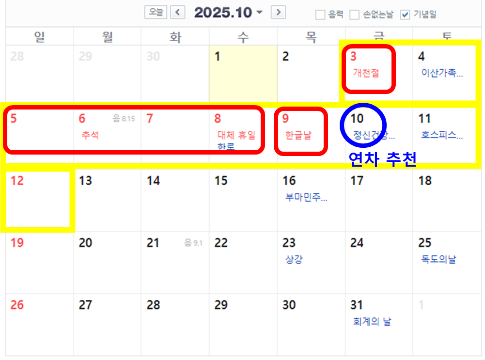 개천절 + 추석 + 한글날이 모두 월 초에 몰려있기 때문인데요. 10월 10일 금요일 하루만 연차를 사용하면 총 10일간의 황금연휴를 즐길 수 있습니다.