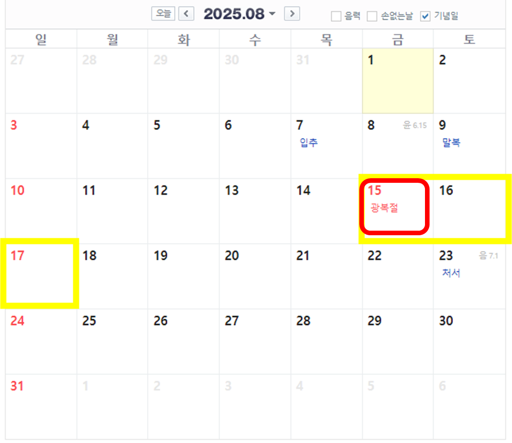 8월에는 광복절이 있습니다. 광복절도 금요일이라서 주말 포함 3일 연휴가 됩니다.
