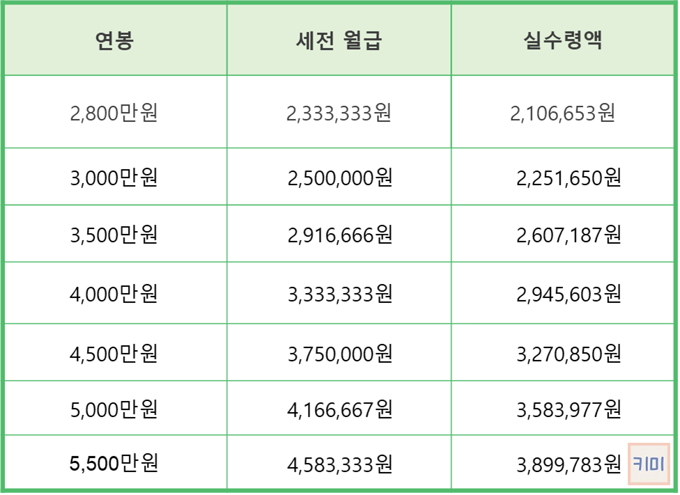 연봉 2,800만원부터 5,500만원까지 연봉금액별 실수령액을 계산하여 정리해 보았습니다.