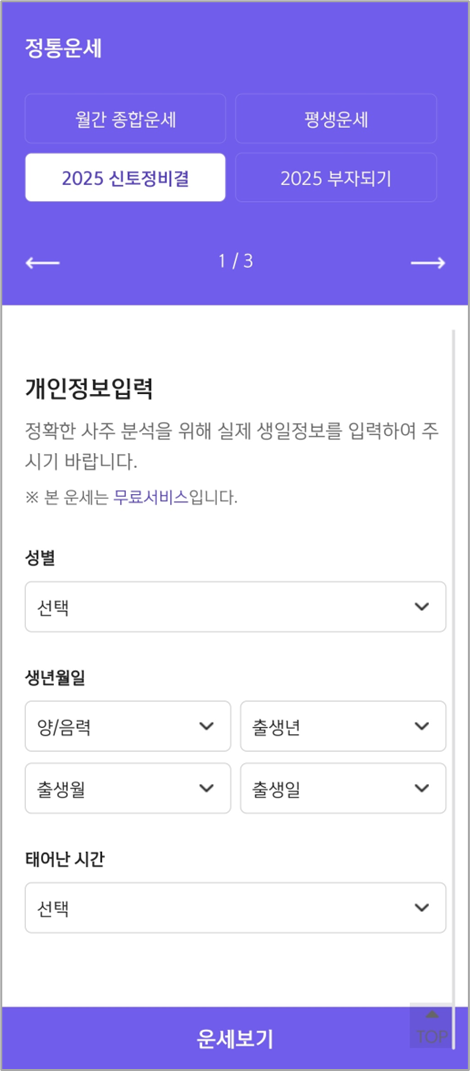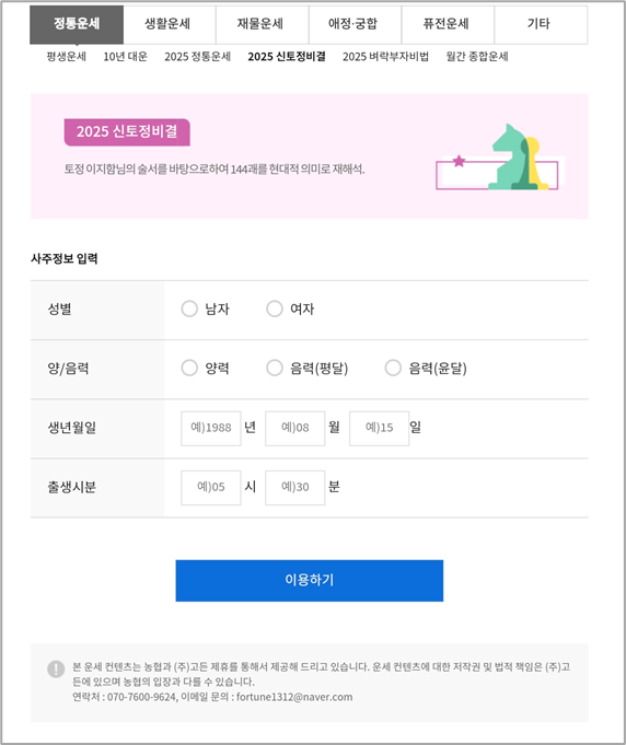 위의 배너를 클릭하여 접속한 뒤, 생년월일과 태어난 시각을 입력하면 2025년 한 해 운세와 재물운, 건강운, 직장/사업운, 월별 운세 등이 자세하게 제공됩니다.