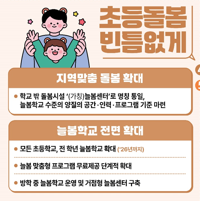 초등생을 대상으로는 2026년까지 늘봄학교를 전 학년으로 확대하고 무상 운영 프로그램도 확대한다고 합니다.