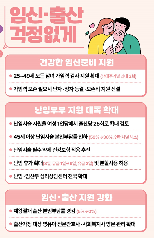 임신·출산을 원하는 부부에 대한 대폭적인 지원을 시행한다고 합니다. 특히 난임시술 본인부담률을 30%로 인하하고, 지원 횟수와 난임휴가를 확대하는 등 난임지원을 대폭 늘릴 예정이라고 합니다.
