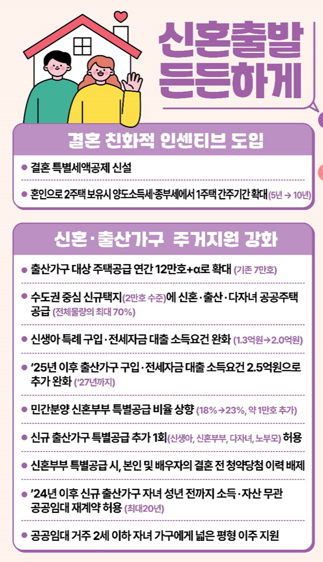 결혼 및 출산 시 집 문제가 걸림돌이 되지 않도록 신혼·출산·다자녀가구 주택공급을 확대하고, 신생아특례대출 소득기준을 사실상 폐지한다고 하니 신혼부부에게 좋은 기회가 되겠습니다.