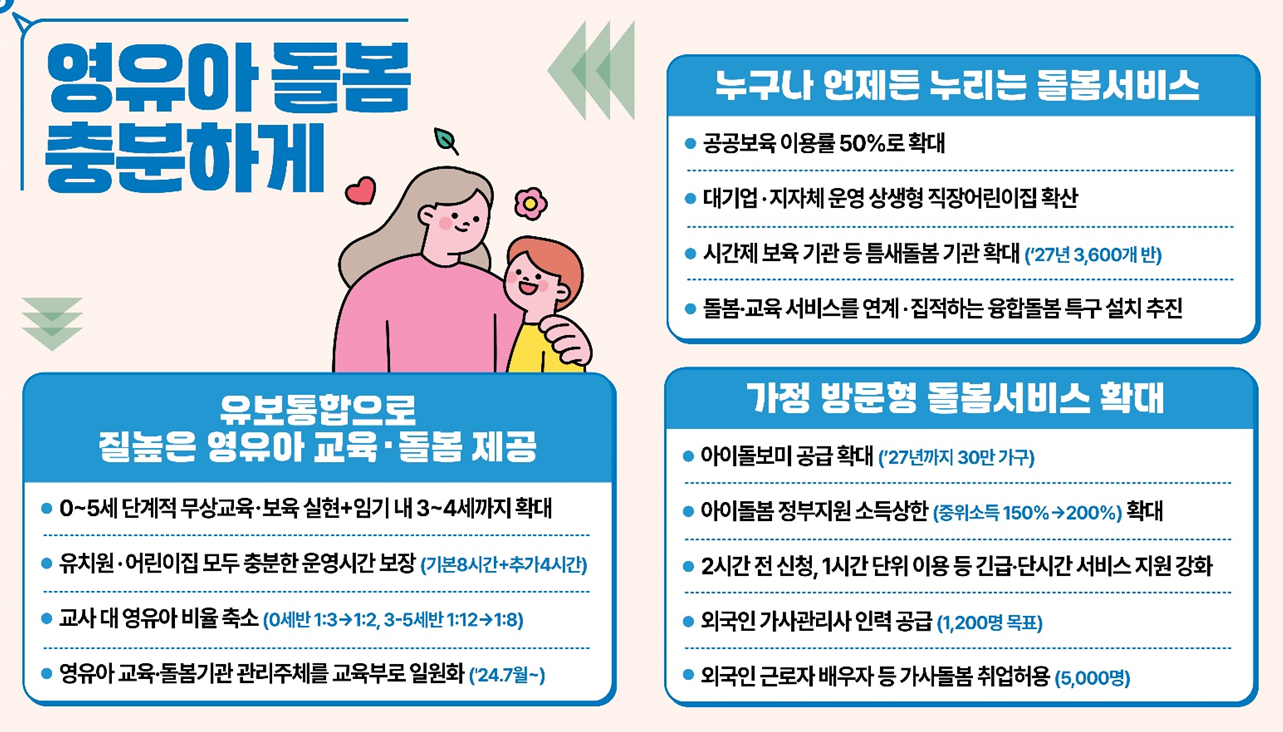 0~11세까지 누구나 이용할 수 있는 돌봄 서비스를 만들어서 출퇴근 시간, 방학, 휴일 등 틈새 돌봄을 촘촘하게 보장한다고 합니다.