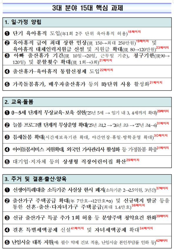 이를 지원 내용 별로 살펴보면 육아시간을 보장하기 위한 일·가정 양립 지원, 교육·돌봄 지원, 가정을 꾸리는데 걸림돌이 없도록 돕는 주거 및 결혼·출산·양육 지원, 그리고 임신과 출산을 준비하는 부부를 위한 임신·출산 지원이 있습니다.