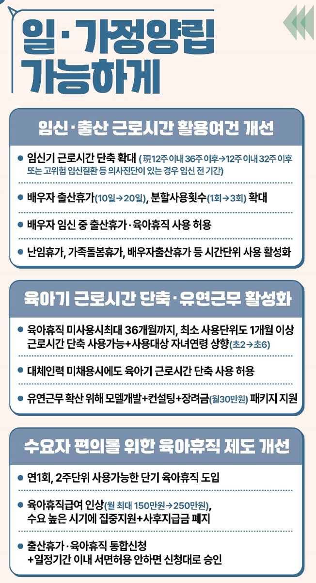 필요할 때 육아휴가, 육아휴직을 눈치 보지 않고 마음 편히 유연하게 사용할 수 있고, 아빠도 육아에 동참할 수 있도록 아빠 출산휴가도 개선한다고 하니 기대됩니다.