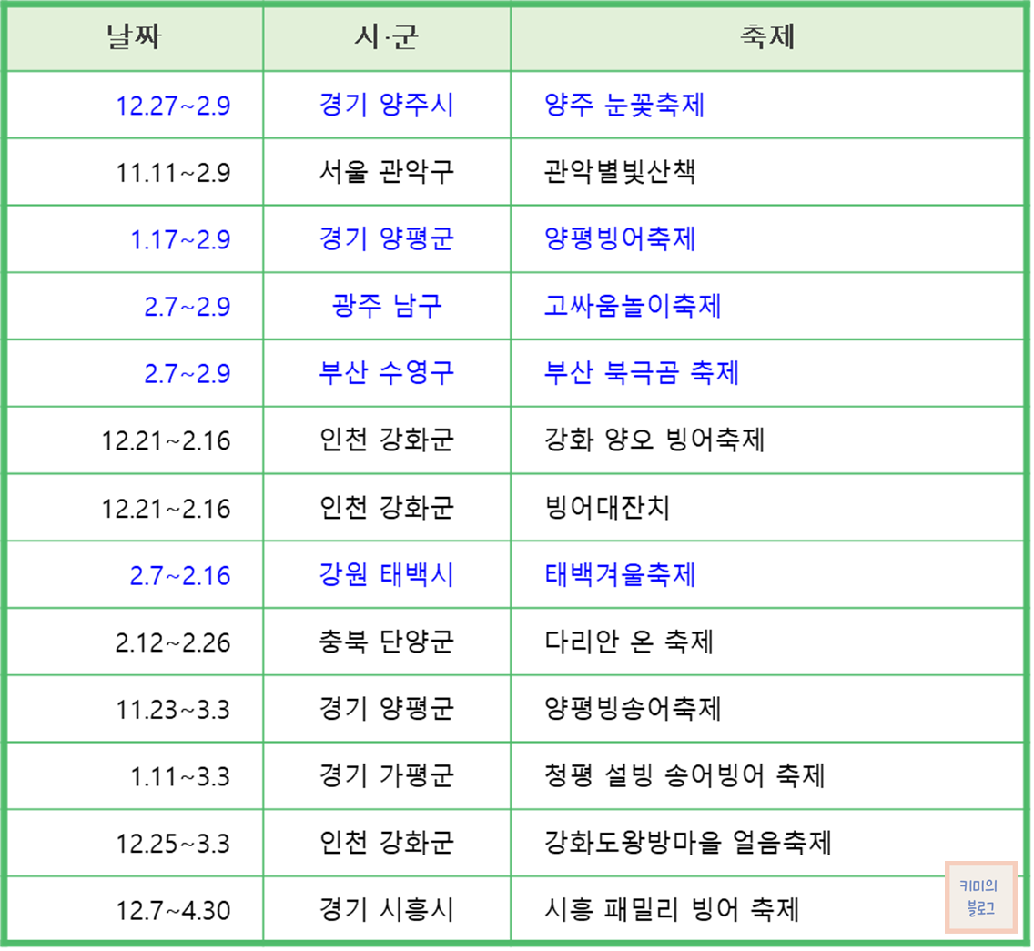 2월은 겨울의 끝자락이라서 12월이나 1월부터 열린 겨울축제가 2월까지 이어지다 마무리되는 경우가 많습니다. 아직 겨울 축제에 못 다녀오신 분들은 이번 글에서 2월에 열리는 축제 일정을 참고하셔서 마지막까지 겨울 분위기를 느껴보시길 바랍니다.