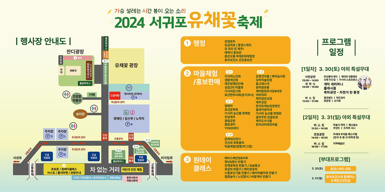 - 주요 프로그램 : 유채꽃밭 체험, 버스킹 공연, 지역 특산물 판매, 사진 콘테스트