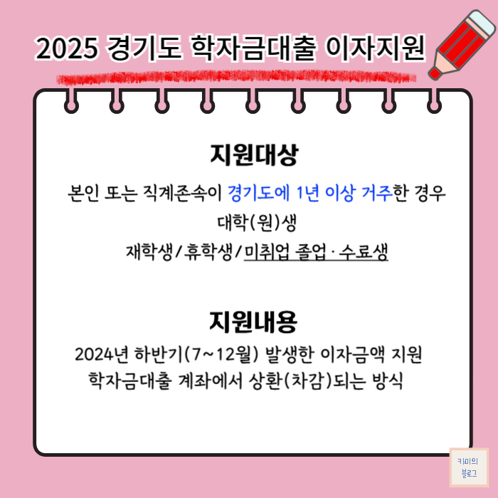 이번 글에서는 2025 경기도 학자금대출 이자지원의 지원대상, 지원내용, 신청기간 및 신청방법에 대해 자세히 알아보겠습니다.