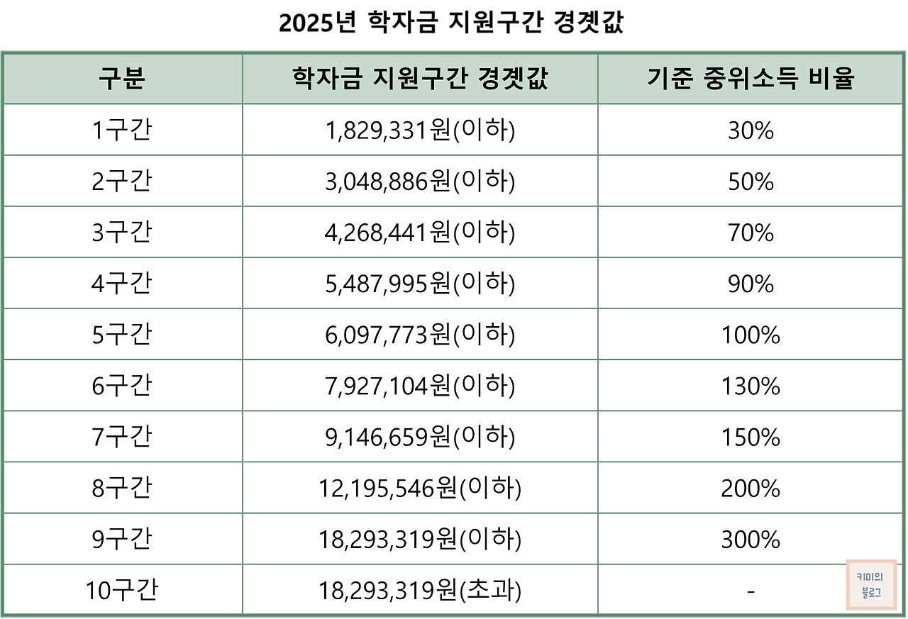 중위소득에 다흔 학자금 지원구간에 따라 장학금액도 다르게 받게 되는데,