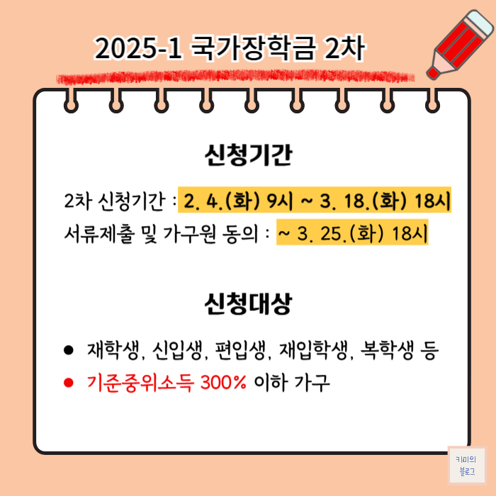 이 글에서는 2025년 1학기 국가장학금 2차 신청기간과 지원대상에 대해 간략하게 요약 정리해 드리겠습니다.