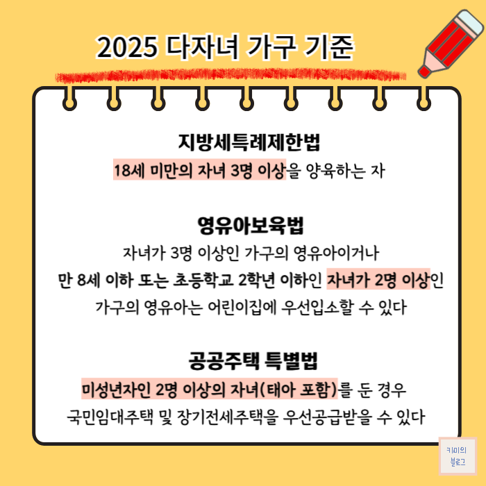 본래 다자녀 가구는 3명 이상의 자녀를 기준으로 했지만, 저출산 현상이 심각해지면서 분야에 따라 다자녀 가구 기준을 2명 이상의 자녀로 완화하는 경우가 많습니다.