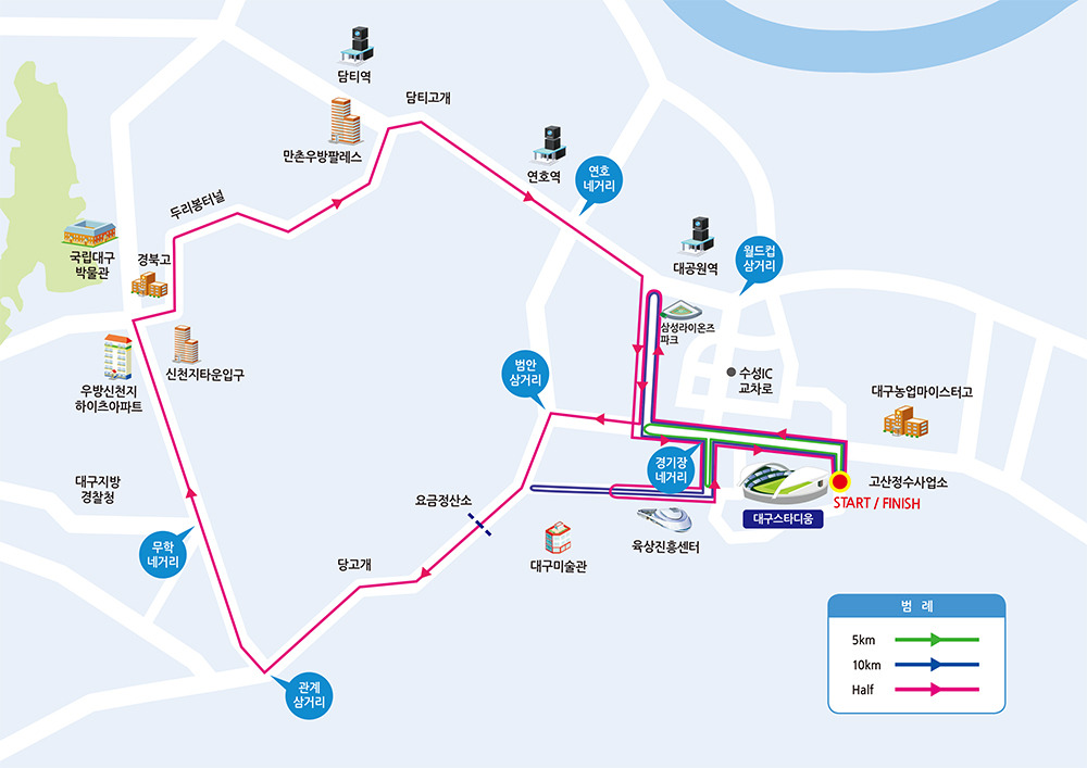 영남일보 국제 하프마라톤 코스 4월 13일 대구스타디움에서는 영남일보 국제 하프마라톤이 열립니다. 영남일보와 대일기획이 함께 주최하는 대회로, 1월 31일까지 신청할 수 있습니다.