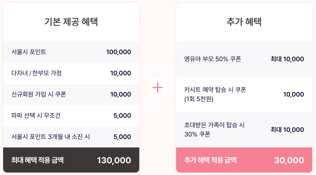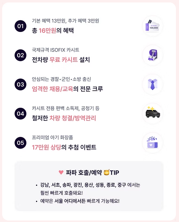 파파 앱에서는 기본 제공 11만원 외에도 신규가입 쿠폰과 친구초대가입 쿠폰, 영유아부모 50% 쿠폰, 카시트 예약 탑승 쿠폰으로 최대 35,000원을 더 제공합니다.