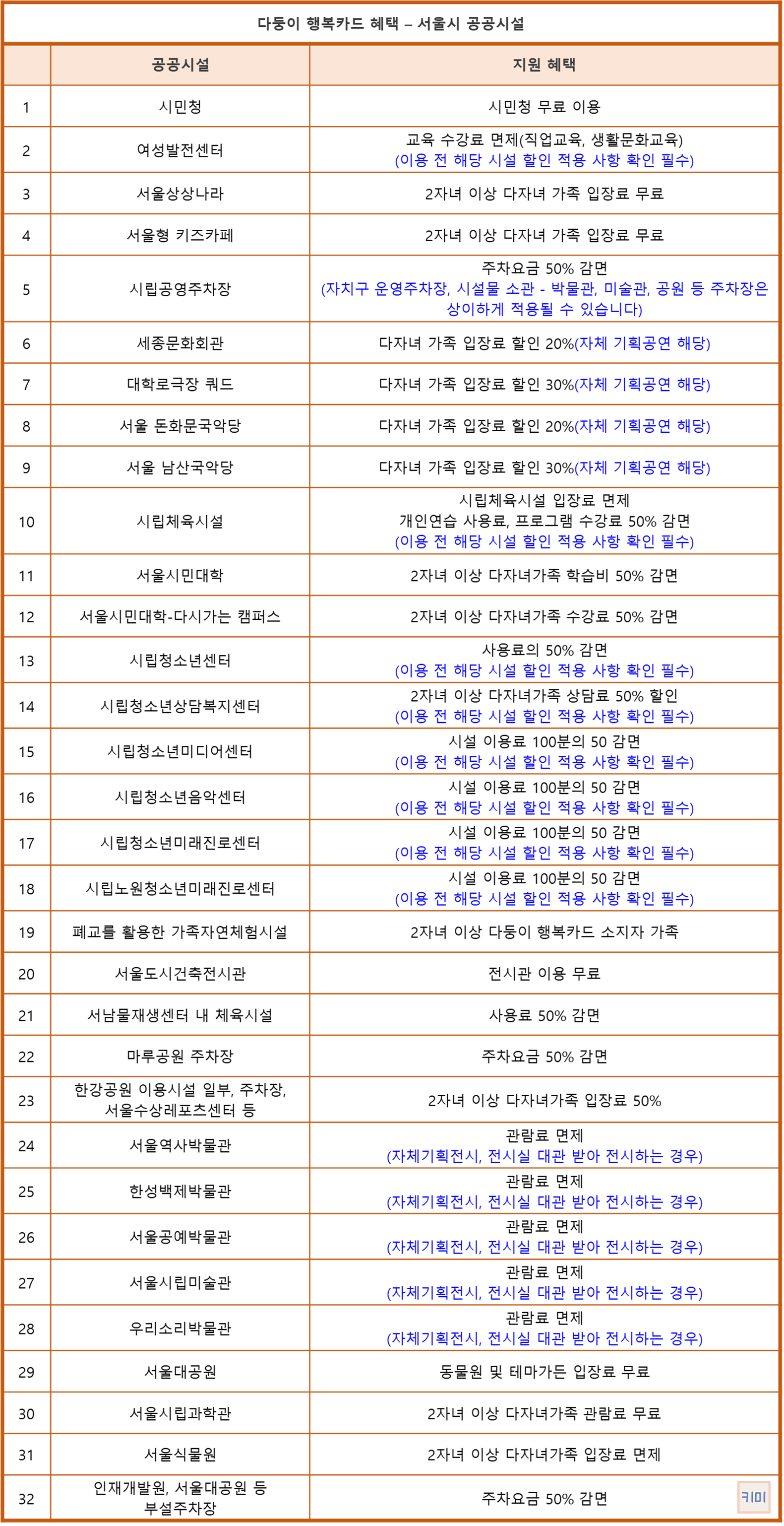 다둥이 행복카드 혜택으로 서울시 공공시설 대부분에서 입장료, 주차요금, 사용료 등을 감면 또는 할인받을 수 있습니다.
