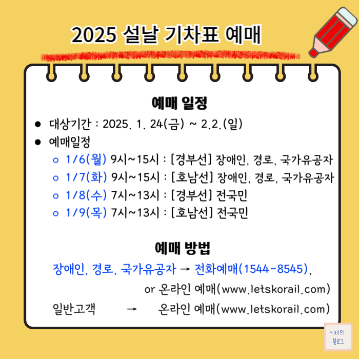 2025 설날 기차표 예매는 1월 6일(월)부터 9일(목)까지 4일 간 가능합니다.