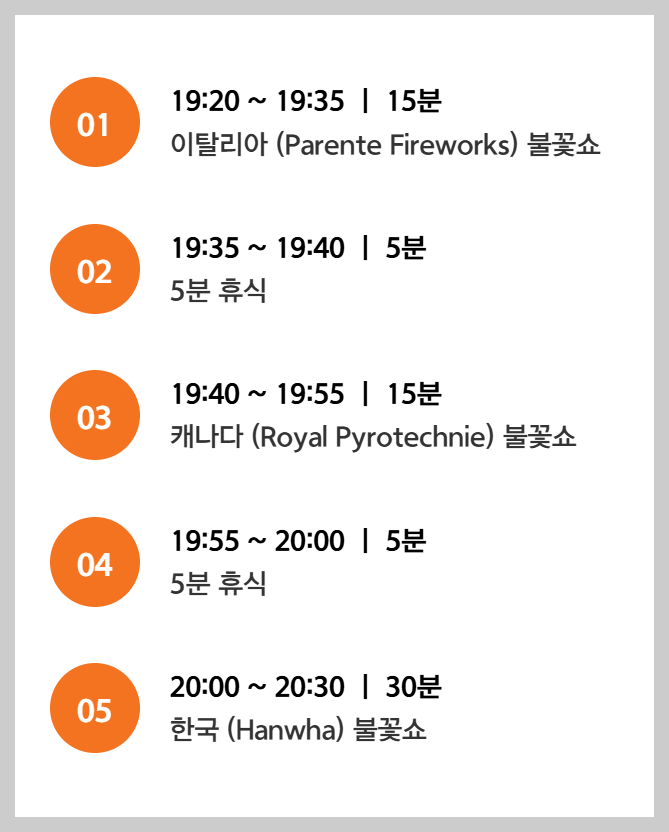 이탈리아팀, 캐나다팀, 한국팀 순으로 진행되며, 8시부터 30분동안은 마지막 순서인 한화(한국팀)의 불꽃쇼가 가장 길고 화려하게 펼쳐지니까 놓치지 마시길 바랍니다.