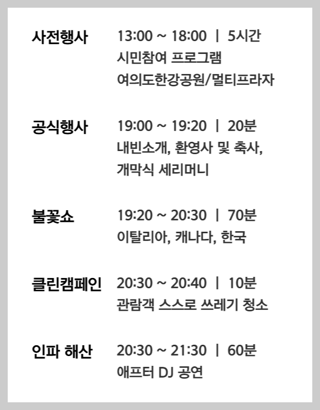 오후 1시부터 여의도 한강공원에서 시민참여 프로그램으로 이루어진 사전행사가 시작되는데, 이때부터 미리 가 있어야 좋은 자리에서 불꽃놀이를 감상하실 수 있습니다.