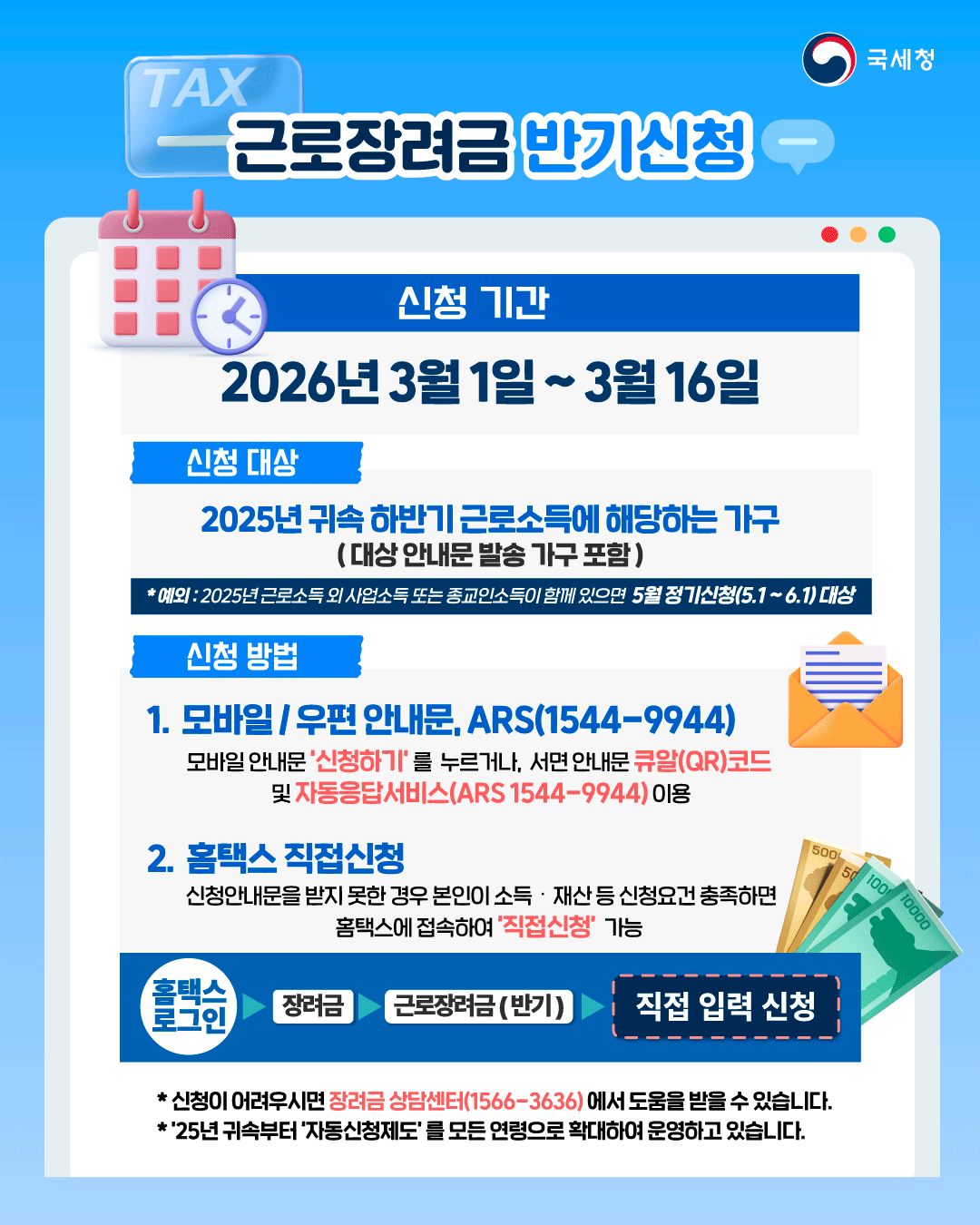 새로운 시작을 알리는 달인 만큼, 우리 지갑을 든든하게 채워줄 반가운 소식 하나를 들고 왔는데요. 바로 2026년 상반기 근로장려금 반기신청 안내입니다!