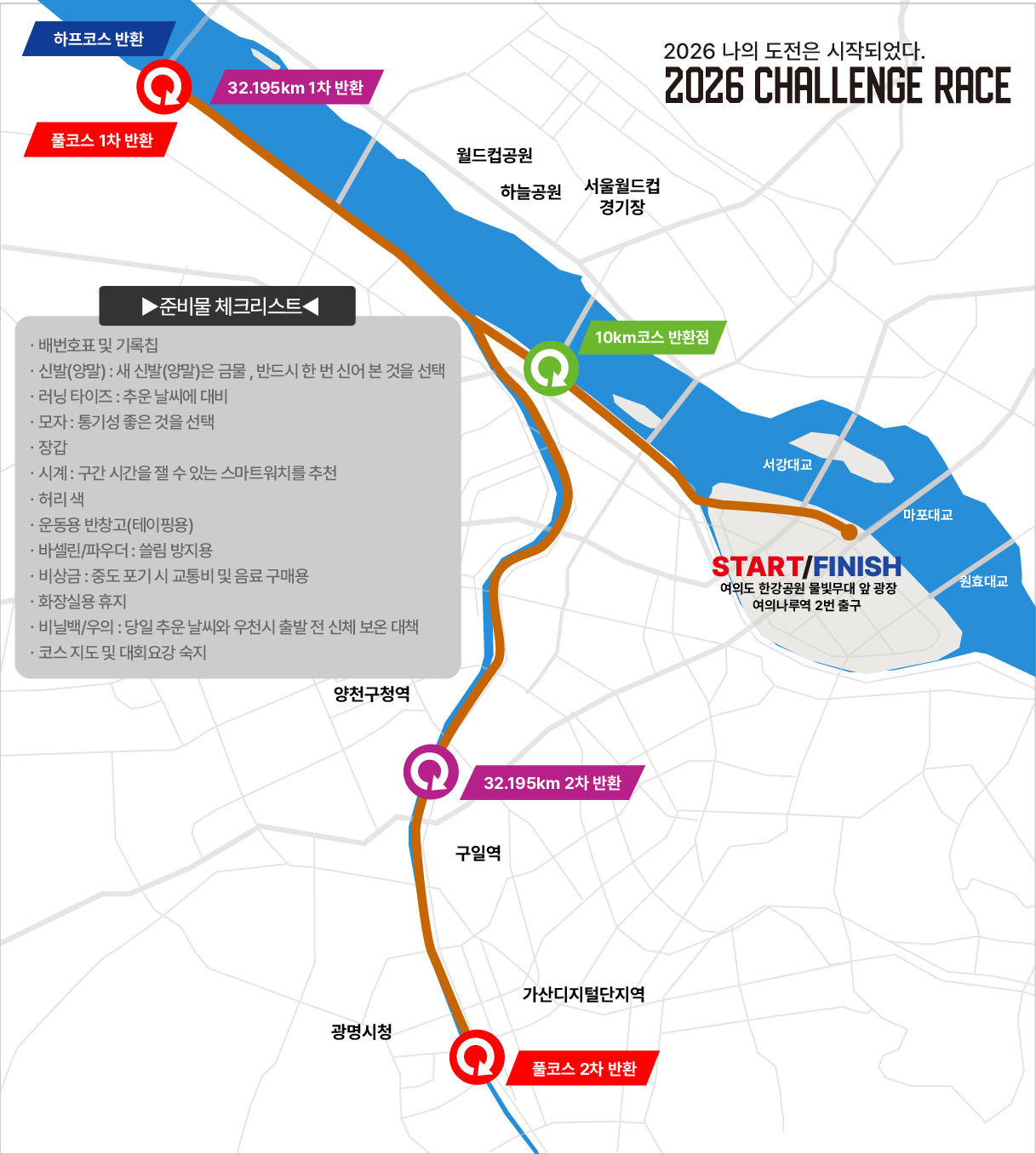 2월 22일 일요일에는 여의도 한강공원 물빛무대에서 2026 챌린지 레이스가 열립니다. 풀코스, 32km, 하프, 10km 총 4종목으로 진행되며 로드스포츠가 주최합니다.