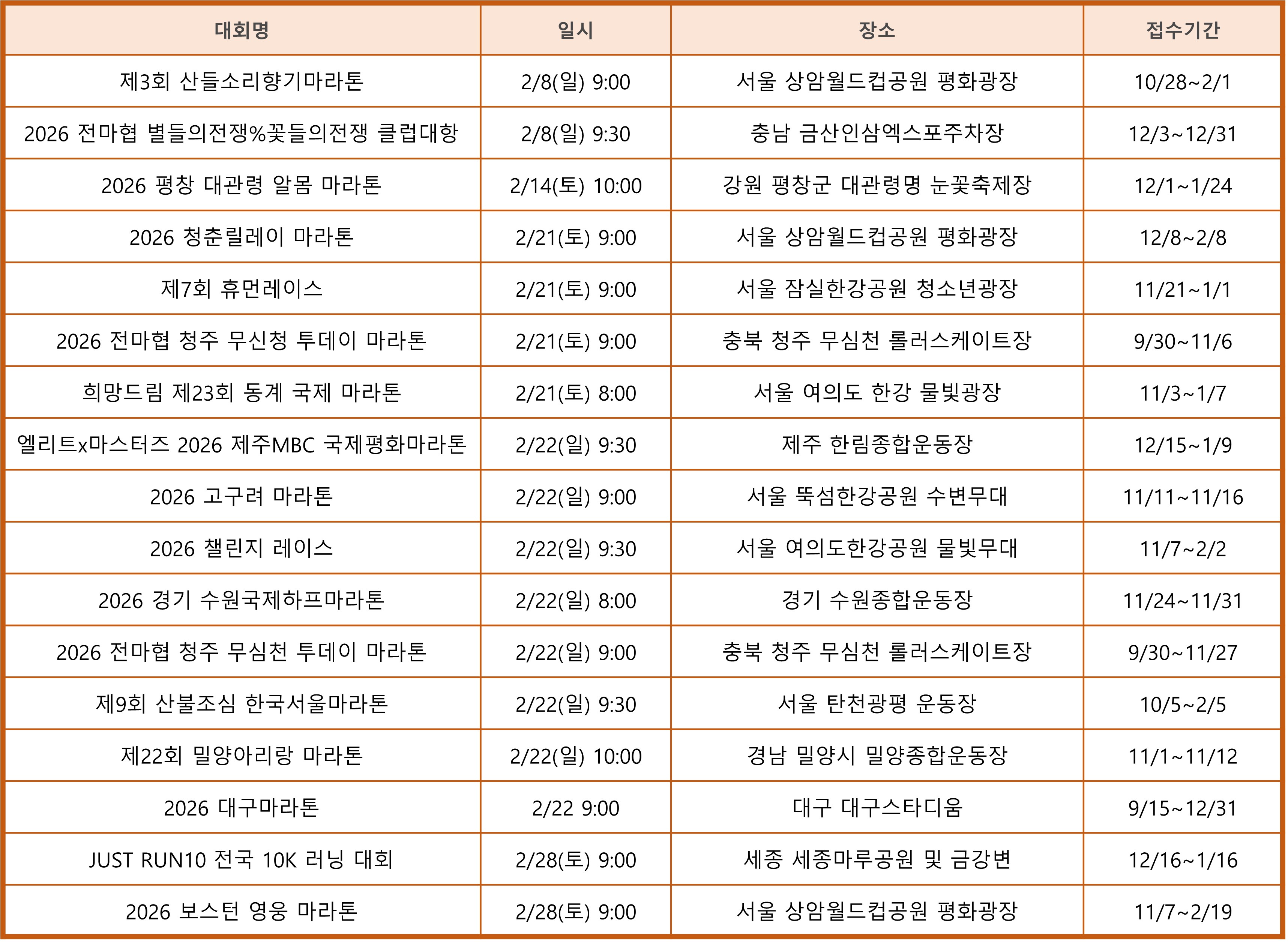 이 글에서는 2026년 2월에 열리는 전국 마라톤 대회의 일정과 참가비, 코스, 접수방법까지 모두 정리했습니다.