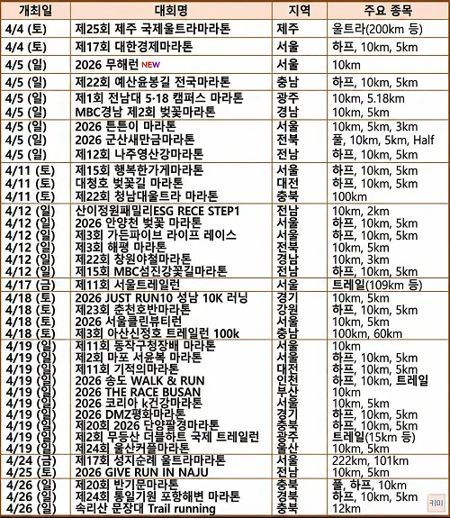 이제 벚꽃과 함께 본격적인 달리기 시즌이 시작됩니다.2026년 4월 마라톤 일정을 잘 확인하시고, 무리하지 않는 선에서 즐거운 러닝 되시길 바랍니다!
