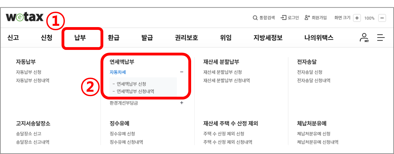 - PC: 위택스(Wetax) 접속 → 부가서비스 → 자동차세 연납 신청