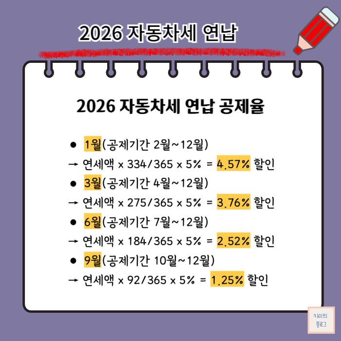 2026년 자동차세 연납 할인율은 작년과 같이 5%이며, 1, 3, 6, 9월 중 일찍 납부할수록 공제기간이 길어서 공제율이 높아집니다. 즉, 이왕 낼거면 일찍 낼수록 더 할인받을 수 있는 겁니다.