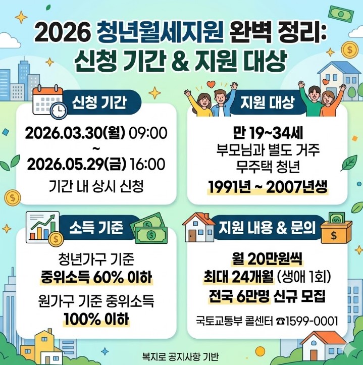 드디어 오늘, 2026년 3월 30일(월) 오전 9시부터 청년들의 주거비 부담을 획기적으로 줄여줄 '2026 청년월세 특별지원' 신청이 시작되었습니다!