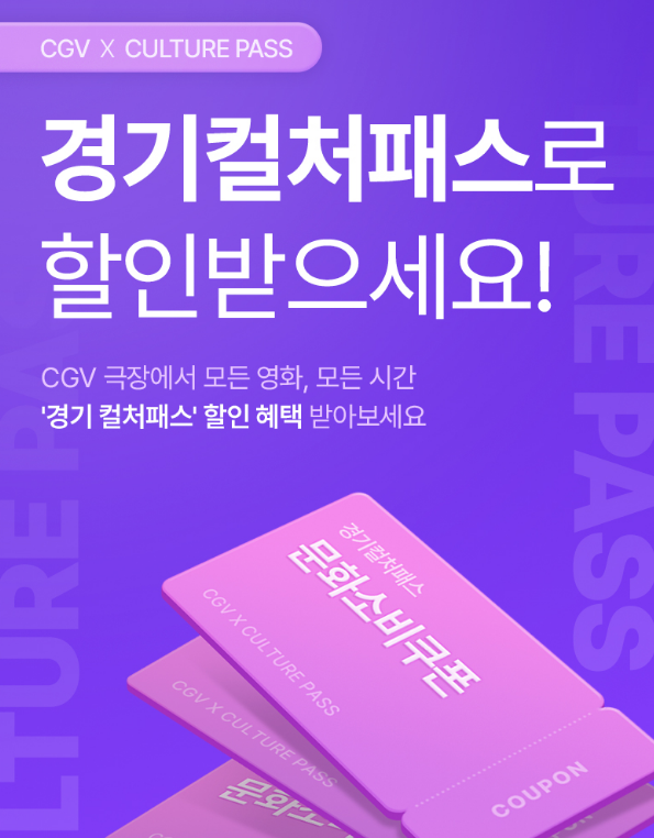 - 이용 방법: '경기 컬처패스' 앱 다운로드 ➔ 회원가입 및 경기도민 인증 ➔ CGV 할인 쿠폰 즉시 발급 ➔ CGV 모바일 앱 결제 단계에서 쿠폰 번호 적용