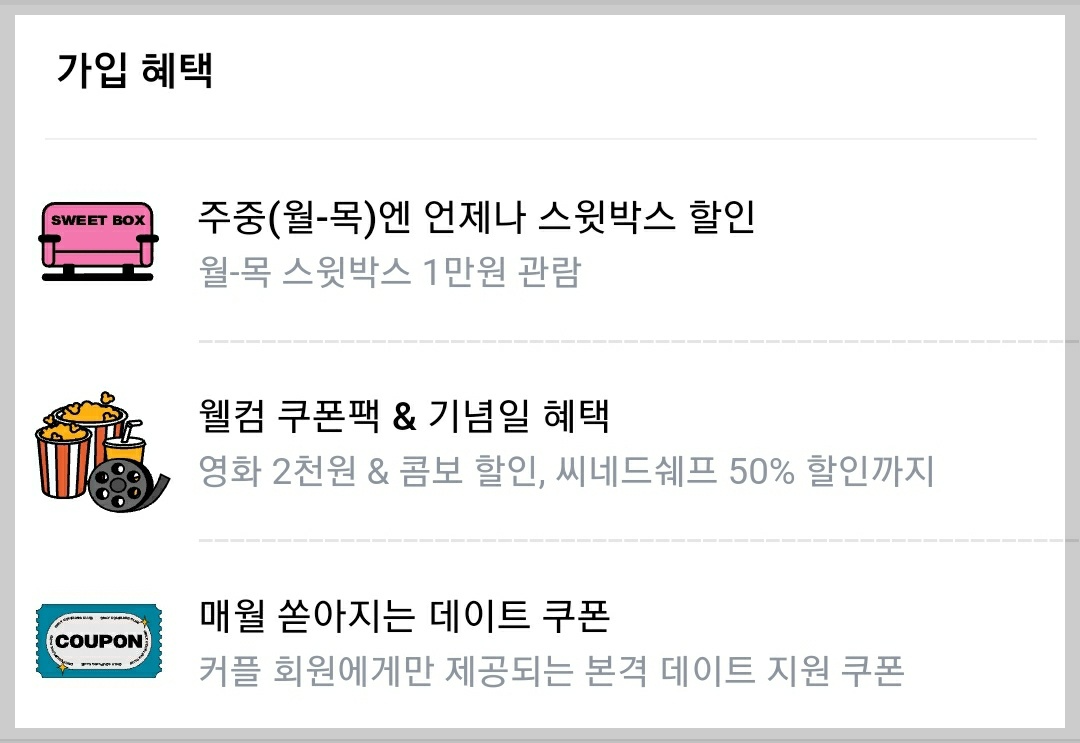 - 가입 즉시 혜택: 앱에서 파트너와 커플 등록을 완료하면 즉시 일반 영화 2~3천 원 할인 쿠폰과 매점 콤보 2~3천 원 할인 쿠폰 등이 각자의 ID로 자동 지급됩니다.