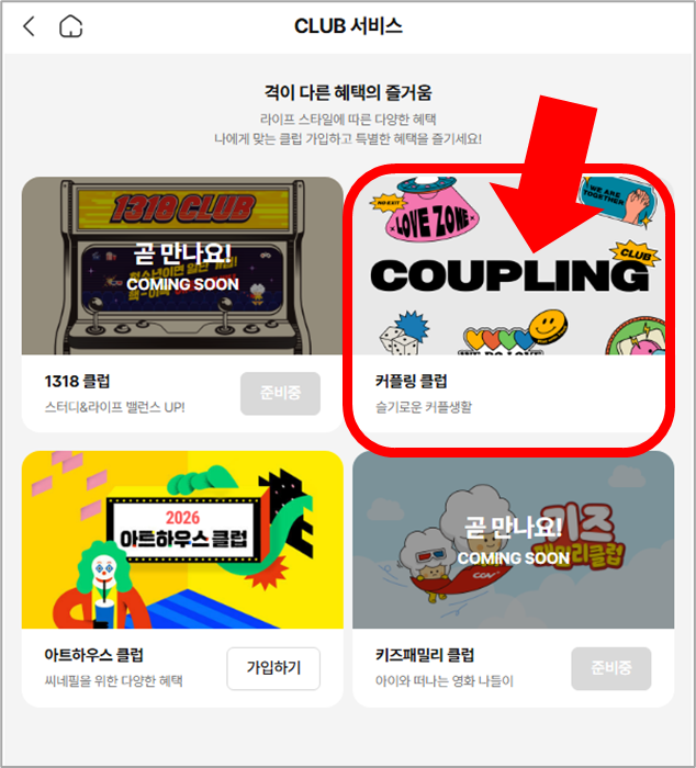 - 이용 방법: CGV 모바일 앱 접속 ➔ 전체 메뉴 ➔ [커플링 클럽] ➔ 파트너에게 카카오톡 등으로 초대 링크 발송 ➔ 상대방이 수락하면 즉시 활성화