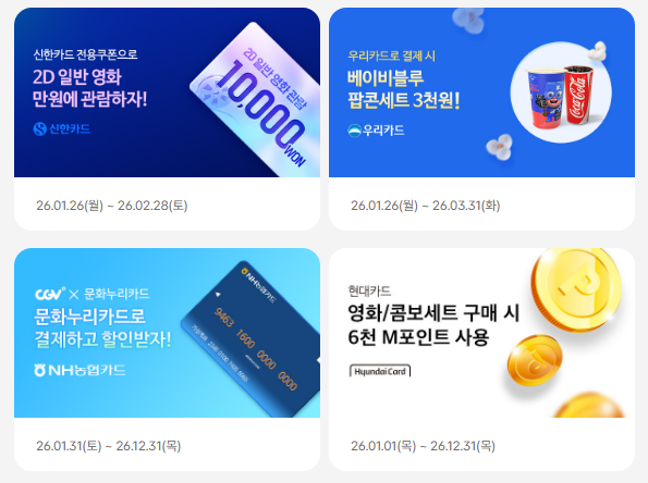 - 혜택: CGV 영화 관람 시 6,000원 또는 10,000원 즉시 할인 쿠폰 제공