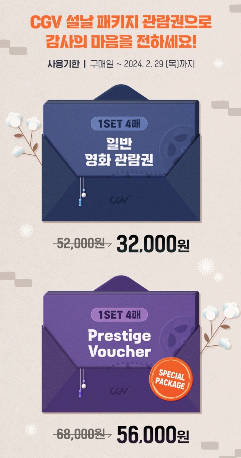 CGV는 가끔씩 영화 관람권을 할인 판매하곤 합니다. 요즘은 설날 패키지 관람권이 있어서, 1매당 8,000원꼴로 이용할 수 있습니다. > CGV 설날 패키지 구입하기
